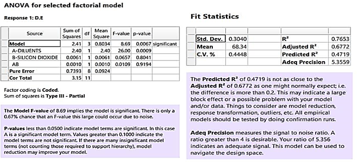 Analysis of the evaluation data generated for dissolution efficiency by applying ANOVA suggested that the significant factors affecting dissolution efficiency were the grade of lactose and the amount of silicon dioxide. F value for silicon dioxide and the interaction term was at p ≥ 0.05 and suggested low confidence in the inference drawn. Thus, the effect of silicon dioxide on the dissolution efficiency of solid dispersion has to be planned with logical modifications to refine the results. Design space is applicable to scale up and to a site change and working within a design space is not considered as a change. As per ICH Q8 (R2) guidelines, the factorial design was adopted to establish design space. The fit statistics (table 5) suggested that the selected levels of factors (two grades of lactose and the amount of silicon dioxide) can be used to navigate the design space.