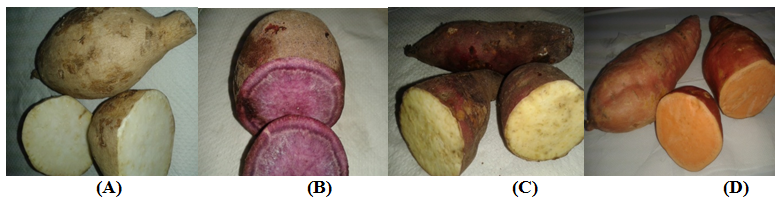 Fig. 1: Types of Malaysian sweet potato tuber with different flesh colours, A-Orange Flesh, B-Yellow Flesh, C-Purple Flesh, D-White Flesh