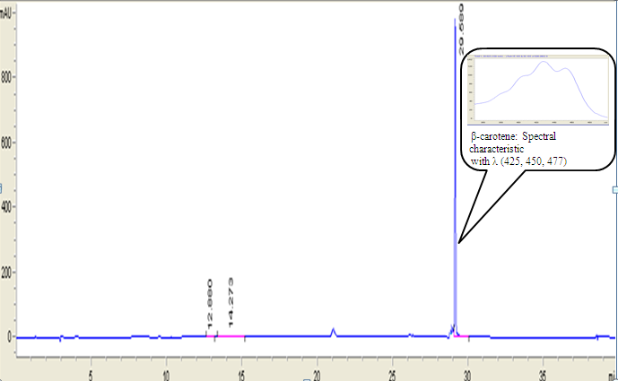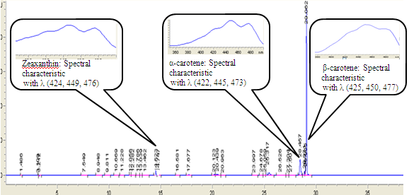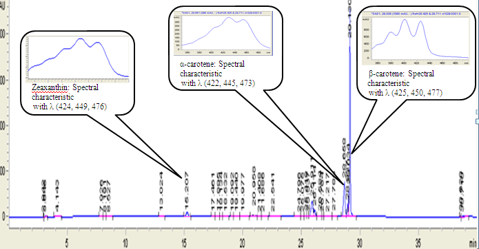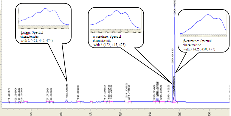 Fig. 2 showed HPLC chromatograms of carotenoids in orange, yellow, purple and white sweet potato flesh and their spectral characteristics. Most of the carotenoid compounds absorb maximally at three different wavelengths, resulting in three-peak spectra. The greater the number of conjugated double bonds, the higher the λmax values [31]. The retention time and the spectral characteristic can be used for individual carotenoid confirmation and each sweet potato sample detected by HPLC was compared to the previous study reported by Norshazila [31]. The retention time for individual carotenoids in sweet potato was; lutein at 10.669 minutes, zeaxanthin at 14.717 minutes, α–carotene at 28.810 minutes and β-carotene at 29.194 minutes.