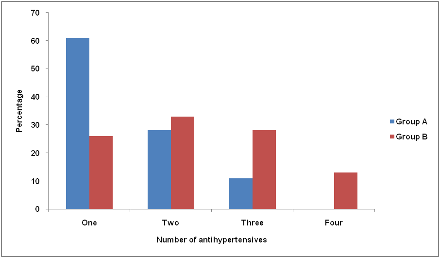 Single antihypertensive was used for 183(61%) patients in Group A which none of the patients had a four-drug combination. For Group B, 67(33%) of the patients were prescribed two-drug Combination antihypertensives. In fig. 1, the number of drug combinations is shown for patients in Group A and Group B.