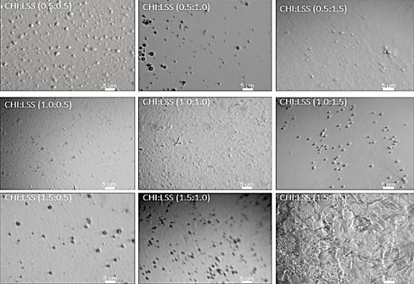 Thehomogenization process rendered AA microcapsules with a different morphology and particle size depending on the CHI: SLS ratio employed (Fig. 1). For instance, F1and F2 runs, containing 0.5% w/v concentration of CHI rendered the largest number of microcapsules that were widely spread once dried, whereas high CHI levels larger than 1% w/v led to coalescence of particles forming a continuous film with a rough surface due to their high surface energy.