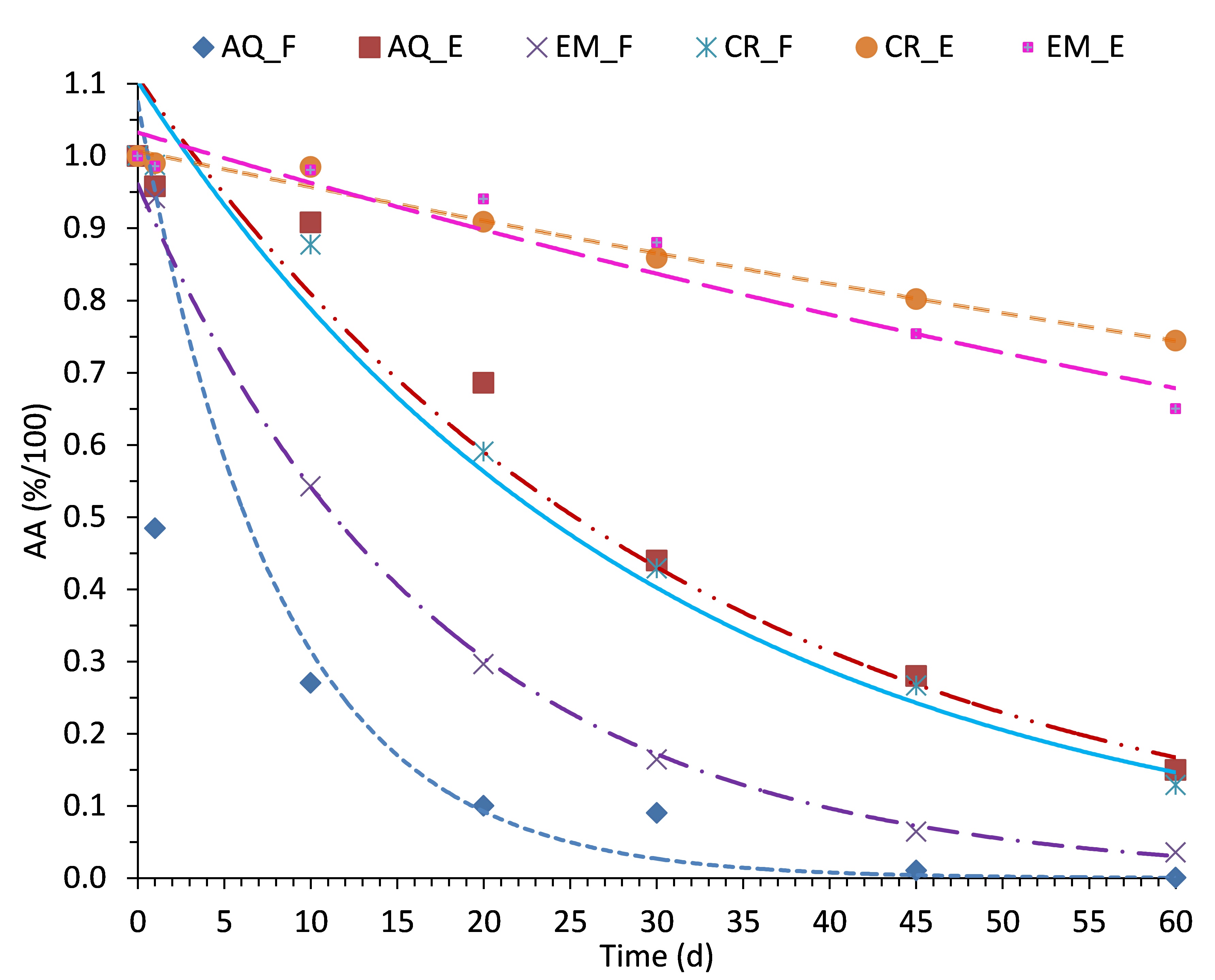 AQ_F: Aqueous dispersion with free AA; AQ_E: Aqueous dispersion with encapsulated AA; EM_F: Emulsion with free AA; EM_E: Emulsion with encapsulated AA; CR_F: semisolid product with free AA; CR_E: Semisolid product with encapsulated AA