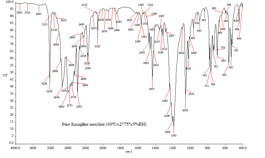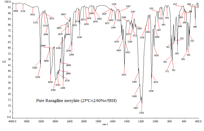 Fig. 2: FTIR spectra of pure Rasagiline mesylate (25°C±2/60%±5RH) FTIR spectra of pure Rasagiline mesylate are presented in each fig. together with single excipients spectrum is shown in the Fig. 3-5.