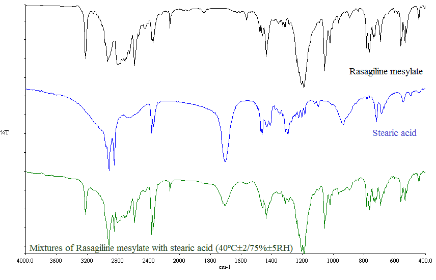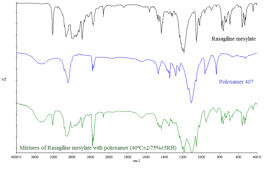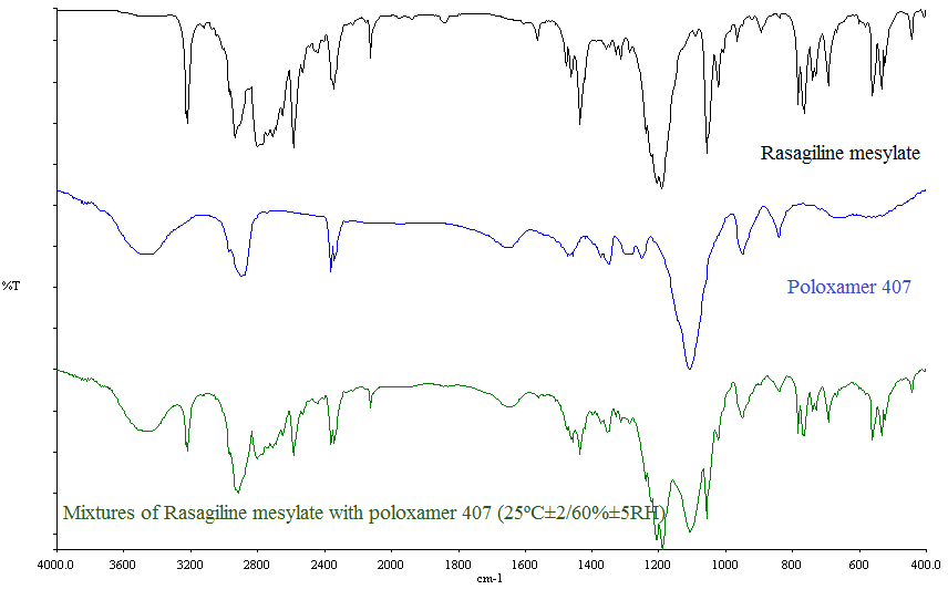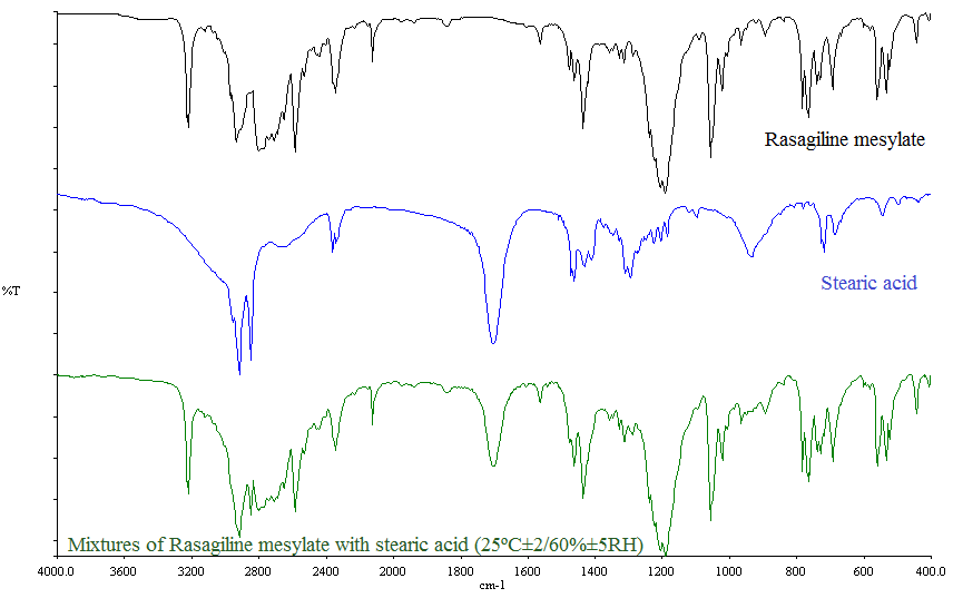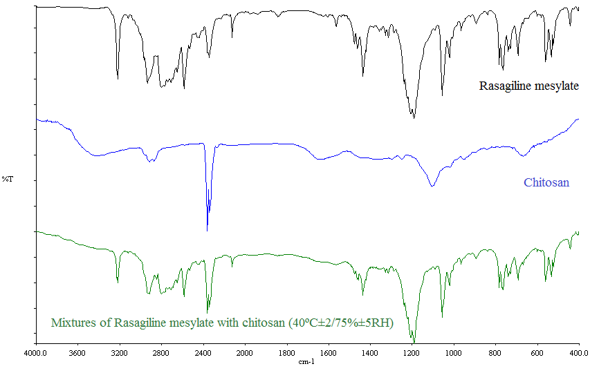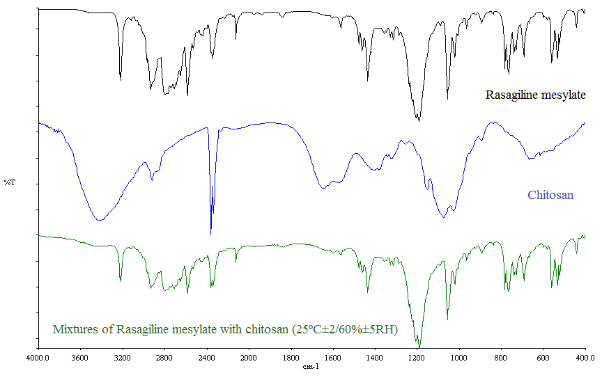 The mixture of Rasagiline mesylate with selected polymers (Chitosan and Stearic acid) and surfactant (Poloxamer 407) was prepared in 1:1 w/w ratio by the simple blending of the components in a mortar with pestle for 10 min at room temperature. The drug and polymers individually weighed in glass vials, each vial was sealed with Teflon-lined screw cap and the mixture of drug and polymers were stored in two different conditions at 25°C±2/60%±5 RH and 40°C±2/75%±5 RH for one month.