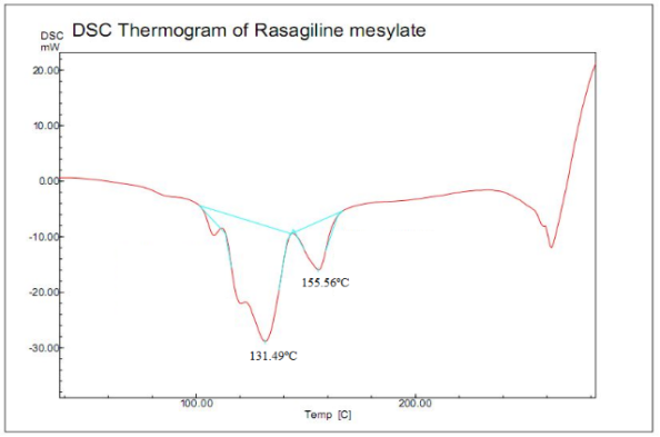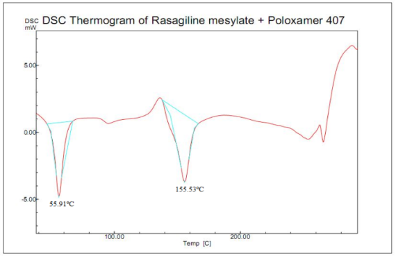 The DSC curve of Rasagiline mesylate and Poloxamer 407 showed endothermic peaks at 55.91°C and 155.53°C in fig. 13. In this Rasagiline mesylate melting peak appears at the same value of temperature (155.55 °C). The binary mixtures of thermogram indicate no interaction between these substances.