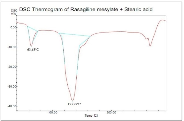The DSC thermogram of Rasagiline mesylate showed an endothermic peak at 131.49°C (It represents the dehydration of bound water) and 155.56°C (melting point). Rasagiline mesylate-Stearic acid mixtures showed the endothermic peak at 63.63°C and 153.97°C (Fig.11). The melting endothermic peak of Rasagiline mesylate at 155.56°C in Rasagiline mesylate-Stearic acid mixture confirms there is no interaction between Stearic acid and Rasagiline mesylate.