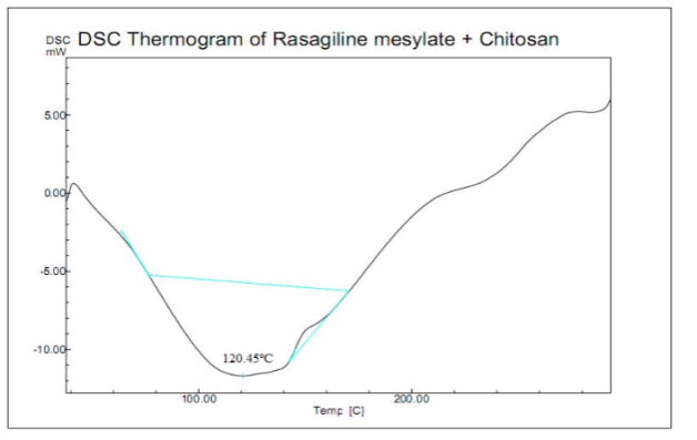 DSC thermogram of Rasagiline mesylate and Chitosan can be observed in Fig.12 and it showed the endothermic peak at 120.45°C. There was no peak appears in the range of Rasagiline mesylate melting peak. The thermogram of Rasagiline mesylate and Chitosan mixture confirm that Chitosan was incompatible with Rasagiline mesylate.