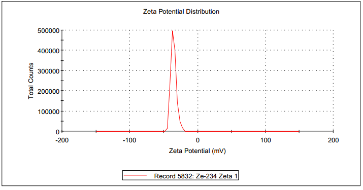 Zeta potential of Rasagiline mesylate loaded SLNs formulation was determined by laser Doppler electrophoresis (Zetasizer Nano ZS, Malvern, UK). The samples were diluted with deionized distilled water with a conductivity adjusted to 50µS/cm with sodium chloride. Helmholtz–Smoluchowski equation was used to convert the measured electrophoretic mobility to zeta potential. [26,29]