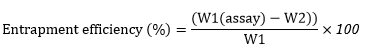 The entrapment efficiency (EE) of the RM loaded SLNs was determined by measuring the concentration of free drug inthe supernatant obtained after centrifuging at 16,000rpm for 30 mins at 0°C (Remi C 24, Mumbai, India). The amount of free drug was detected by HPLC (Thermoscientific, spectra system P-4000, USA) and the incorporated drug was calculated by subtracting free drug from total amount of drug in the formulation. The EE was calculated by using the following equation,[26,31]