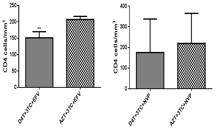 Fig. 1: (a) Comparing AZT+3TC+EFV and D4T+3TC+EFV on CD4 count, **P ≤ 0.001 using unpaired test, 1(b) Comparing AZT+3TC+NVP and D4T+3TC+NVP on CD4 count