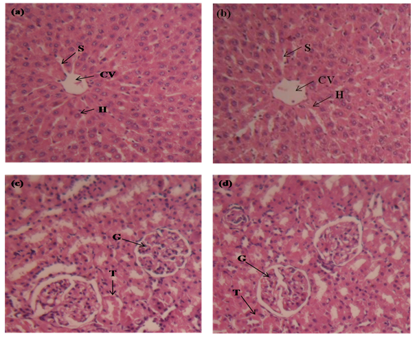 Fig. 1: a) Liver section of normal control rats showing normal hepatic cells. b) Liver sections of V. negundo (5 g/kg) treated rats showing no structural changes. c) Kidney sections of rats treated of normal control. d) Kidney sections of rats treated with V. negundo (5 g/kg) showing normal cellular architecture. Letters represents S: sinusoids; CV: central vein; H: hepatocytes in liver and T: tubules; G: glomerular capsule in the kidney. (Photomicrographs of liver and kidney sections at lower doses were not shown).