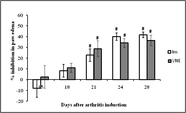 Increase in paw volume, a measure of edema caused due to inflammation was studied in various groups of animals. The paw volume of all the animals was measured by plethysmometer (Scientech, Indore, India) at every 3rd day from the day of arthritis induction (day 0) to the end of treatment (day 28th). The % inhibition in paw volume due to the effect of indomethacin and VNE were calculated from the following formula