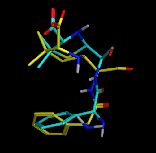 Fig. 2: Alignment native ligand (cyan) and docked ligand (yellow) PDB ID: 5HL9