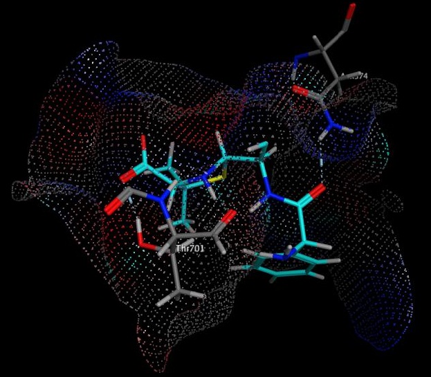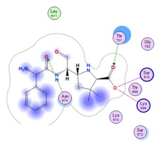 Native ligand of ampicillin showed important amino acids that interacted with target proteins such as Asn574, Thr701, Ser510, Lys698. In its interactions, ampicillin involved O (C = O) atom from the carbonyl amide group interacting with Asn574 residues via hydrogen bonds (H-acceptor), carbonyl O (C = O) in carboxylic group interacting with Thr701 via hydrogen bonds (H-acceptor) and the carboxylate group of O (OH) with Ser510 and Lys698 interacting via ionic bonds fig. 3.