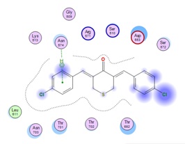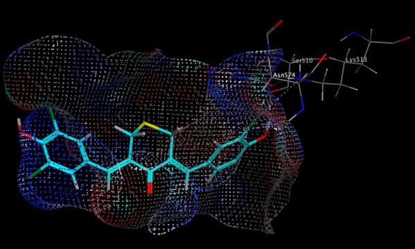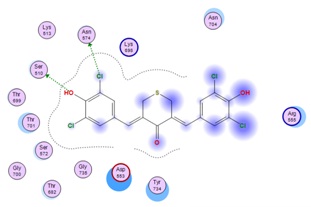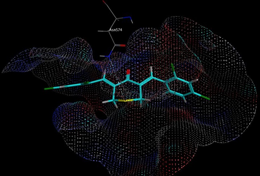 That was because the geometry of Cl atom formed tetrahedral sp3 in ortho position would disturb the other atoms around it (steric factors) so that it could inhibit resonance into the aromatic ring. The steric effect of the Cl atom in ortho position caused the compound ability to resonate towards the Cl substituent in para position, so the compound’s electrophilicity decreased so there was no interaction with the target protein. D156 showed similar interaction with native ligand since the structure of test compound had an interaction involving the amino acid Ser510 via H donor and Asn574, H acceptor via hydrogen and semipolar bonds. Theoretically, chlorine atom would deactivate the benzene ring, but in silico illustrated that electronegative atom was the center of action other than carbonyl since it seemed that some amino acids could interact with it fig. 6.