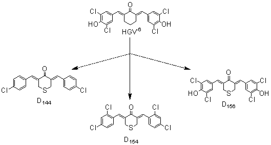 3,5-bis-(4´-chlorobenzylidene)-tetrahydro-4H-thiopyran-4-one (D144); 3,5-bis-(2´,4´-dich lorobenzylidene)-tetrahydro-4H-thiopyran-4-one (D154); 3,5-bis-(3´,5´-dichloro-4´-hydro xybenzylidene)-tetrahydro-4H-thiopyran-4-one (D156); 2,6-bis-(3´,5´-dichloro-4´-hydroxybenzylidene)-cylcohexanone (HGV-6), PBP 1a).