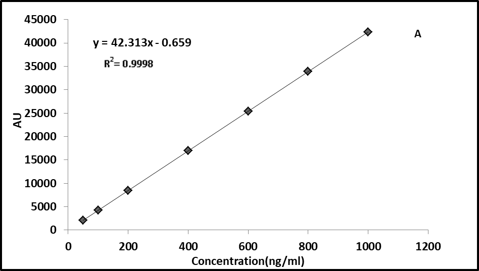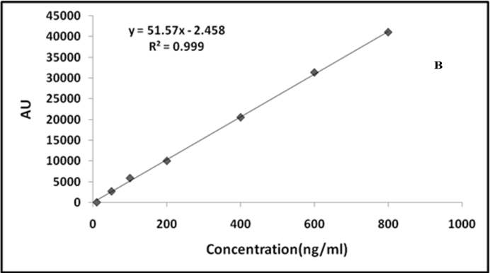 The standard calibration curve of ondansetron in human plasma is plotted in (fig. 1b) A straight line was obtained with an excellent correlation coefficient (R2 = 0.9993), which reflects good linearity of the relationship over the investigated concentration range (20-800 ng/ml). The retention times obtained for ondansetron in human plasma were around 1.55 min.