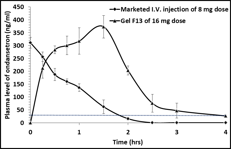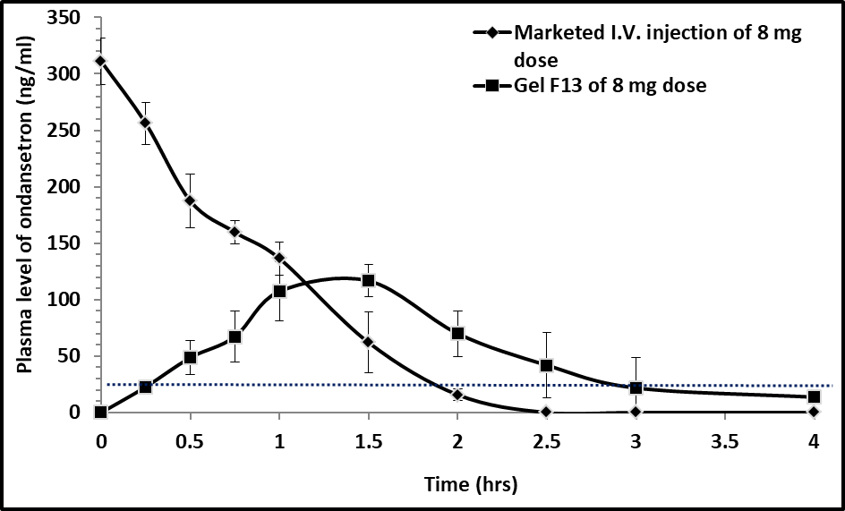 Results: Ondansetron gel (0.5%) showed detectable plasma concentration 22.833±2.17 ng/m1 after ¼ h and 419.55±2.17 ng/ml after 1-h post-treatment in rabbits and human respectively and concentration was maintained above-reported minimum effective concentration for more than 2.5 h for rabbits and 7 h for humans compared to 1.75 h after I. V. administration.