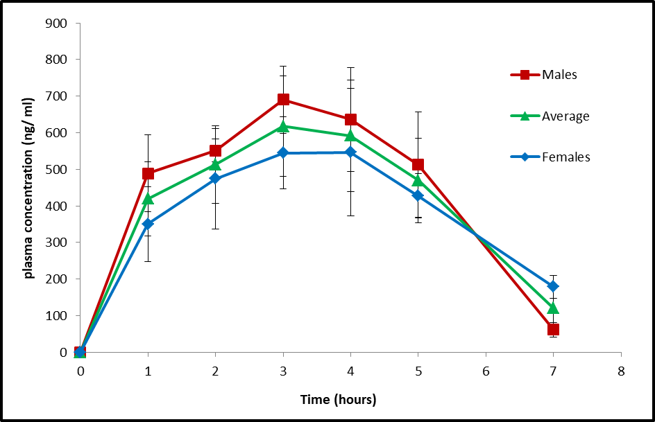Fig. 4: Mean plasma concentration–time profiles following administration of ondansetron gel F13 0.5% (8 mg) in males and females