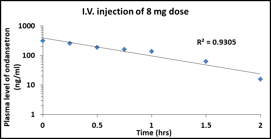The plasma profile of ondansetron after I. V. administration in the rabbits shows the Cmax: 311.037±20.518 ng/ml just after injection. The plasma concentration decreased to reach (15.743±5.444 ng/ml) at 2 h after injection. The pharmacokinetic parameters of ondansetron were assessed and listed in tables 1-3.