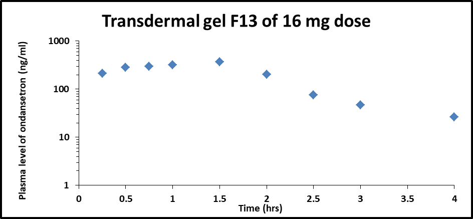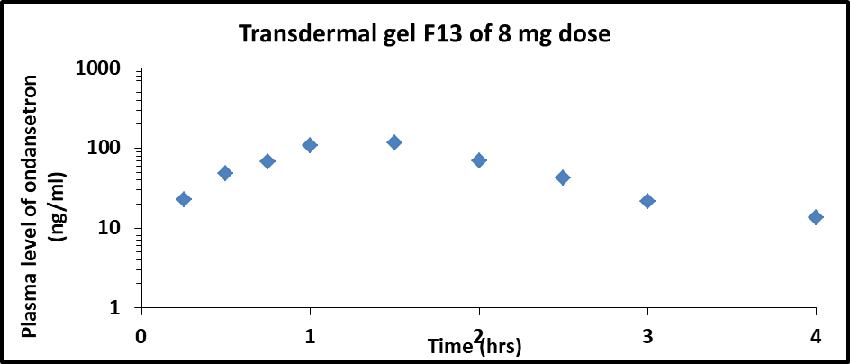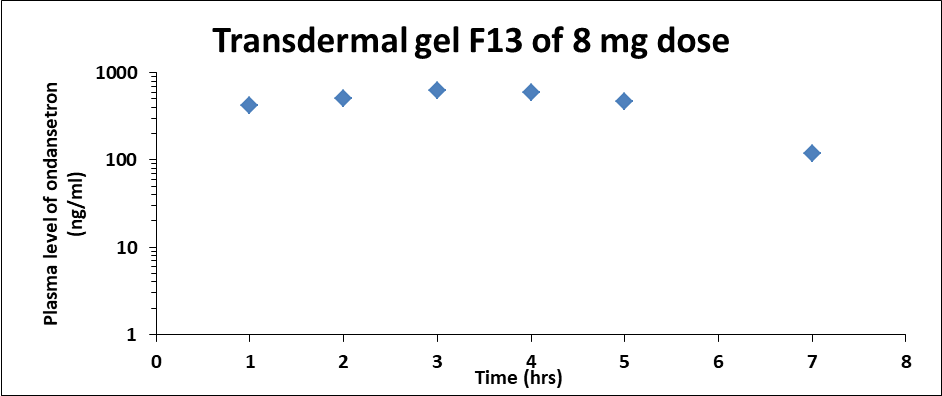 The plasma drug concentration of transdermal gel formula which contains 0.5% ondansetron increased progressively to reach maximum concentration Cmax of (116.669±14.418 ng/m1) at Tmax of (1.5 h), then decreasing to (13.667±2.082 ng/m1) at 4 h after transdermal administration. While, the plasma drug concentration of transdermal gel formula which contains 1% ondansetron increased progressively to reach maximum concentration Cmax of (373±43.92 ng/m1) at Tmax of (1.5 h), and then decreasing to (26.33±5.508 ng/m1) at 4 h after transdermal administration.