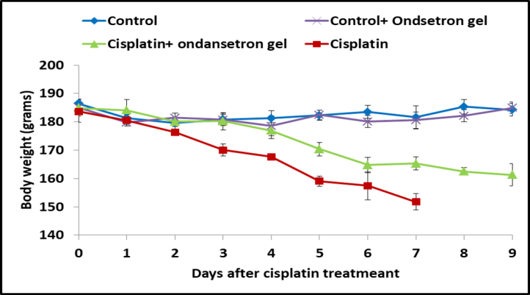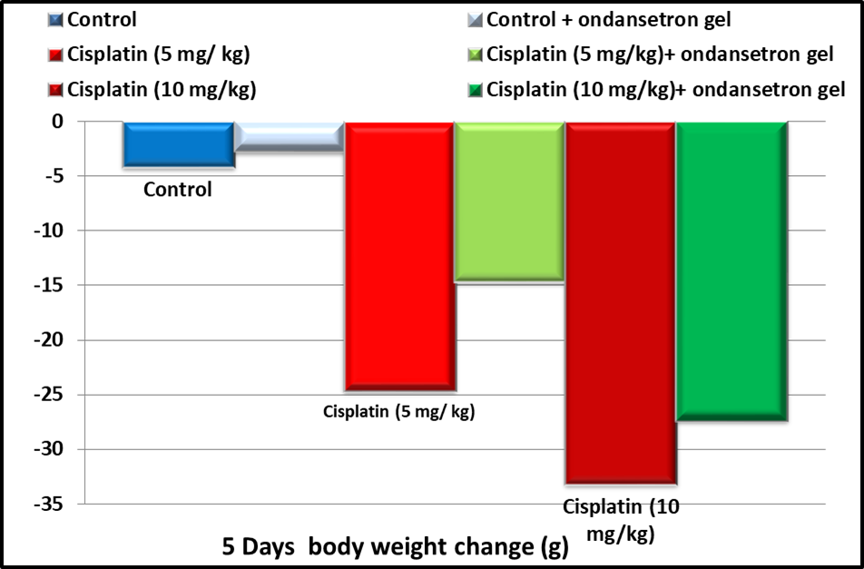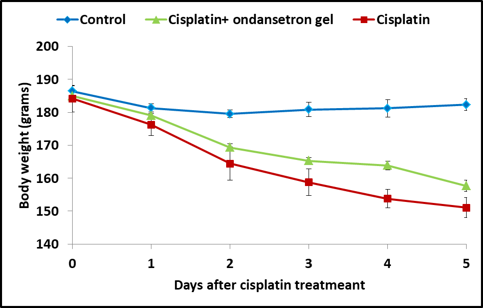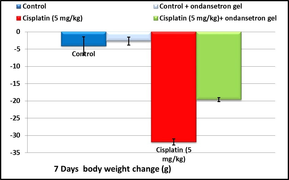 Methods: Ondansetron gel (F13: sodium alginate 7% w/w) was used, marketed I. V. ondansetron (Zofran) ® was chosen as reference. The bioavailability study in rabbits was selected as a parallel design using nine healthy rabbits divided into three groups whereas, bioavailability study in humans was an open-label, wherein 6 healthy subjects administered ondansetron gel. The potential effect of ondansetron gel was evaluated for the prevention of different phases of emesis motivated by exposure to antineoplastic drugs (cisplatin) by determination of body weight loss, water and food intake applying kaolin-pica model in rats using seventy-two rats divided into six groups.