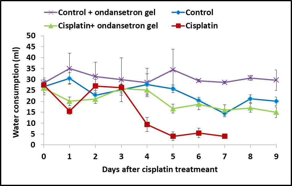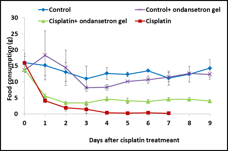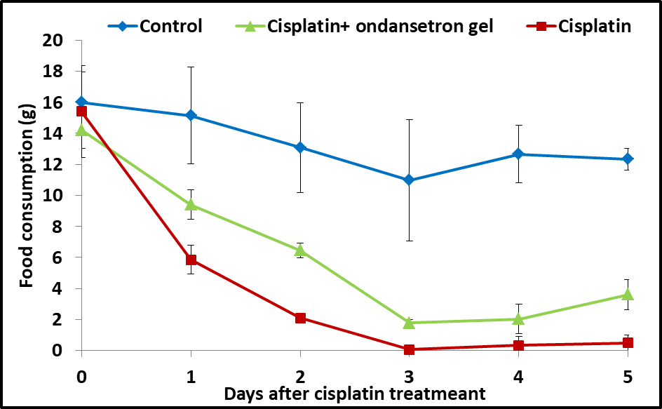 The ondansetron gel significantly reduces all phases of cisplatin-induced emesis and a decrease in body weight, water, and food consumption was significantly attenuated.