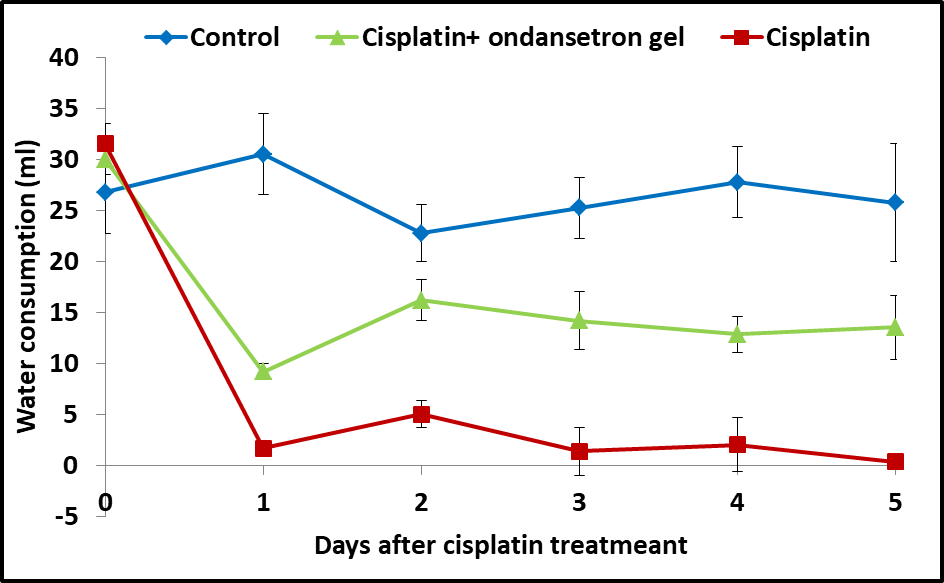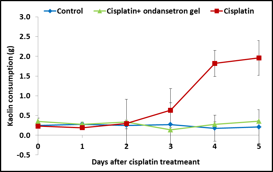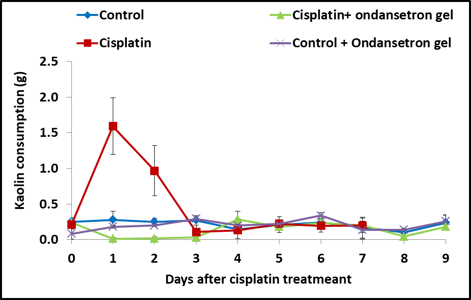 One gram of ondansetron gel 0.5 % was dermally applied on an area of 2 x 3 cm of rat dorsal skin which shaved in the adaptation days before the experiment to animals 12 h before exposure to cisplatin and repeated every 12 h. Rats were returned to cages for the estimation of daily kaolin, water, and feed intake and body weight changes during the next experiment time.