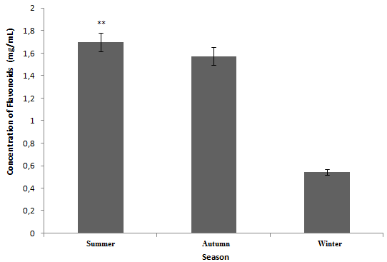 Fig. 1: Total flavonoid content in each season. ** Symbol indicates p<0.001