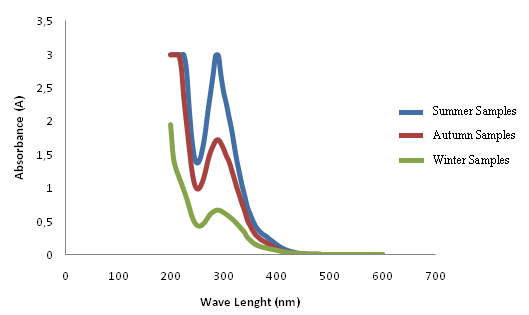 Fig. 2: Spectrophotometric scanning of green propolis extracts produced in summer, autumn and winter