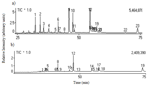 Fig. 3: GC-MS Chromatograms from the standard (a) and the dichloromethane extract of green propolis collected in the summer (b)