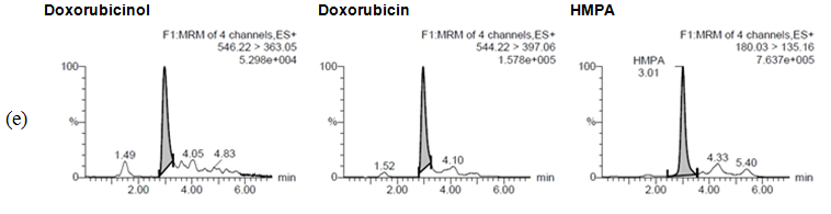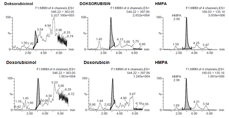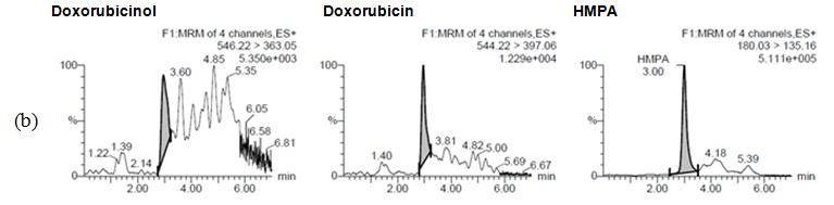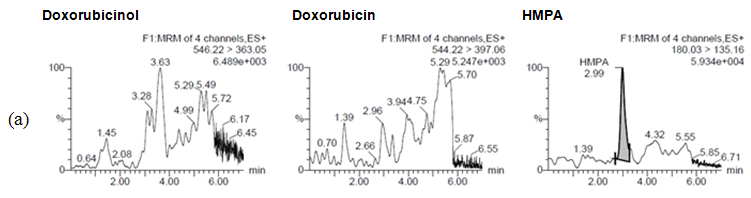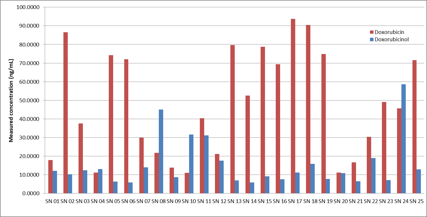 Result: The analysis results showed that doxorubicin levels were in the range of 11.01 ng/ml to 93.75 ng/ml and doxorubicinol was 5.80 ng/ml to 58.57 ng/ml.