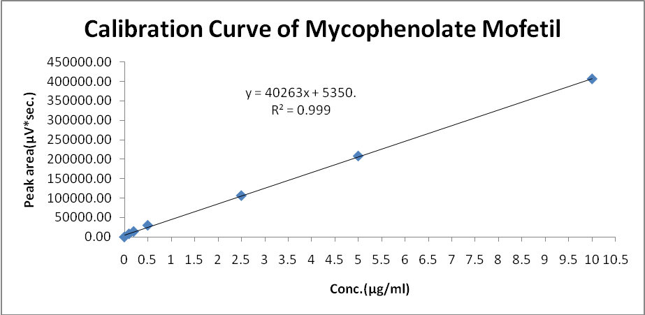 Standard stock solution of MMF was prepared by dissolving 50 mg pure drug in 50 ml standard volumetric flask with methanol followed by sonication for 5 min. The obtained solution of 1 mg/ml was further diluted to prepare six standard concentrations namely 0.1, 0.2, 0.5, 2.5, 5 and 10 µg/ml. Each standard concentration was run in triplicates and the average value was used for the preparation of standard curve by plotting concentration vs peak area. Standard curve was constructed with peak area (Y-axis) against concentration (X-axis) followed by estimation of coefficient of correlation using Microsoft excel. The amount of MMF present in the sample was calculated through the standard curve.