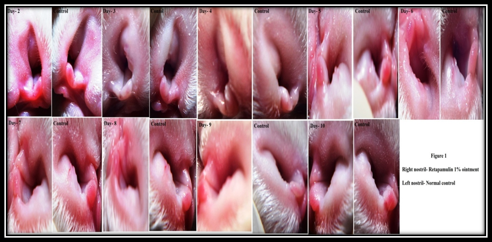 Fig. 1: Effect of retapamulin 1% ointment (Photographs of both nostrils of rabbits from day 2nd - day 10th)