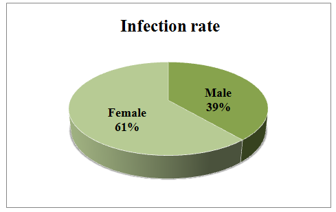 The sex wise perspectives representation (fig. 1) emphasized that the females are commonly affected by ophthalmic infection than males almost in 2:1 ratio. The reason behind the increase exposure in females may be due to their poor immune power and the working habit in the study area where many textile and dye industries are located. The depiction of the age wise occurrences of the ocular infections is tabulated (Table 2). The result showed that the incidence of ocular infection is higher in adults between 20-40 years and the low rate was found in 1-20 years.