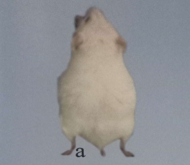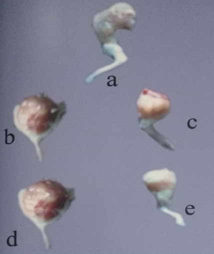 Fig. 4: Showing the morphological changes in the legs bearing tumor after treatment with CPA or/and BM-MSCs compared to control leg (after forty days from inoculation of EAC). (a) normal leg of control mouse, (b) leg of a mouse bearing tumor, (c) leg of a mouse bearing tumor and treated with CPA, (d) leg of a mouse bearing tumor and treated with BM-MSCs and (e) leg of a mouse bearing tumor and treated with CPA and BM-MSCs