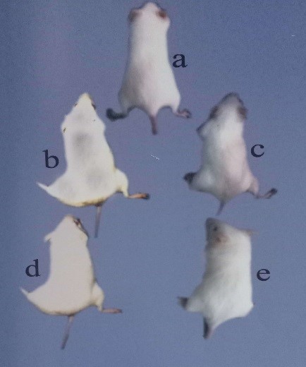 Fig. 3: Showing the anti-tumor activities of CPA or/and BM-MSCs on solid EAC compared to the control group (after forty days from inoculation of EAC). (a) normal control mouse, (b) mouse bearing tumor, (c) mouse bearing tumor and treated with CPA, (d) mouse bearing tumor and treated with BM-MSCs and (e) mouse bearing tumor and treated with CPA and BM-MSCs