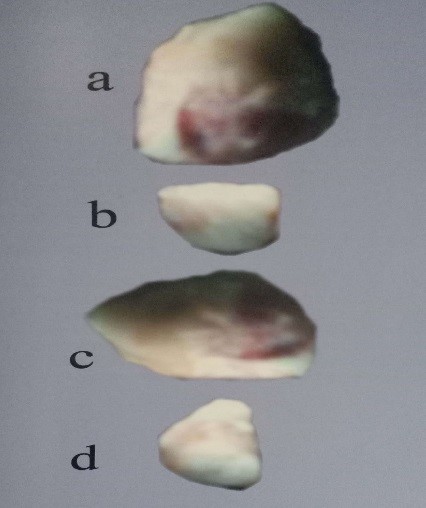 Fig. 5: Showing the reduction in the tumor size after treatment with CPA or/and BM-MSCs compared to the EAC without any treatment (after tumor isolation from the leg) after forty days from inoculation of EAC. (a) tumor of a mouse bearing EAC without treatment, (b) tumor of a mouse bearing EAC and treated with CPA, (c) tumor of a mouse bearing tumor and treated with BM-MSCs and (d) tumor of mouse bearing EAC and treated with CPA and BM-MSCs