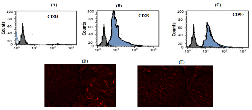 Fig. 2: Immunophenotype of BM-MSCs was examined by flow cytometry. BM-MSCs cells were negative for the hematopoietic marker CD34 (A), while strongly positive for mesenchymal stem cell-specific markers including CD29 (B) and CD90 (C). The blue histograms represent antibody labeled cells while the grey histogram shows the profile of the isotype control. EAC+BM-MSCs group showing PKH26-labelled injected stem cells engrafted in liver tissue (D) and EAC+CPA+BM-MSCs group showing PKH26-labelled injected stem cells engrafted in liver tissue (E)