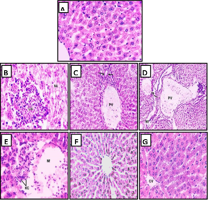 Fig. 6: (A) photomicrographs of H and E stained liver sections of control mice demonstrated the normal hepatic architecture. (X200). (B) hepatic Section of EAC mice displayed distortion in hepatic architecture manifested by leucocytic infiltration area (LIA), necrotic areas (NA) and degeneration of the liver cells that looked empty of nucleus (X400). (C)Liver Section of EAC mice showing swollen in lining epithelia of the bile ductule (arrows), congestion of erythrocytes and leucocytes in portal vein (PV) and leucocytic infiltration (X200). (D) Liver Section of EAC mice treated with CP showing dilatation in portal vein (PV), Leucocytic infiltration (In) and necrotic foci (Nf) (X100). (E) Liver Section of EAC mice treated with CP displayed large necrotic foci (Nf) with scattered inflammatory cells and giant Kupffer cells (KC) (X400). (F) Hepatic section of EAC mice treated with BM-MSCs showed almost normal hepato-cellular architecture (X100). (G) Liver Section of EAC mice treated with CP+BM-MSCs displayed normal healthy hepatocytes around normal central vein (CV) (X200).