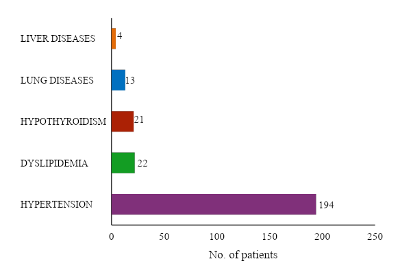 A majority of the participants in this study had co-morbidities, which causes a negative impact on the patient’s quality of life. 194 (65%) patients were found to have hypertension, 22 (7%) patients with dyslipidemia, 21 (7%) patients had hypothyroidism, 13 (4%) patients were found to have lung diseases such as COPD, asthma and bronchitis while 4 (1%) patients had liver diseases such as cirrhosis and hepatitis (fig. 1).
