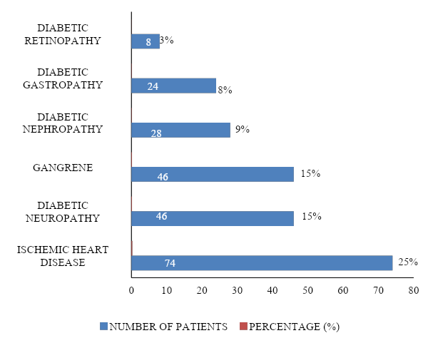 In the present study, 148 patients were found to have diabetic complications. Of whom 74 (25%) patients had IHD, 46 (15%) patients had diabetic neuropathy and gangrene, 24 (8%) patients had diabetic gastropathy, 28 (9%) patients had diabetic nephropathy, and 8 (3%) patients had diabetic retinopathy (fig. 2).
