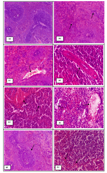Fig. 3(a- h): Histological examination of spleen (H & E.), (a) Normal control group showing normal spleen architecture (X100), (b-f) DMN group showing: (b) degenerative changes with loss of contour of white pulp (X100); (c) haemorrhage in blood sinusoids (X100); (d) Dilated blood vessels with stagnation of blood and thickened trabecular walls lined by inflammatory cells (X400); (e) hyaline material within congested sinusoids and aggregation of deeply stained lymphocytes within the red pulp (X400) and (f) Necrotic areas along whole splenic tissue and red blood cells invaded sinusoidal spaces (X400). (g) PRP injected to DMN group showing reappearance of well-observed malpighian corpusles (X100). (h) QUR administrated to DMN group showing haemorrhage and red blood cells in blood sinusoids (X400).