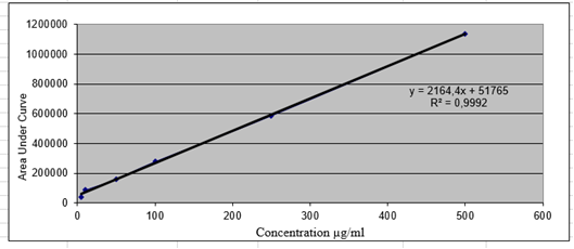 The Celastrol calibration curve is linear with a correlation coefficient (r2 = 0.9992) in the concentration range from 5 to 500 μg/ml as shown in fig. 1.