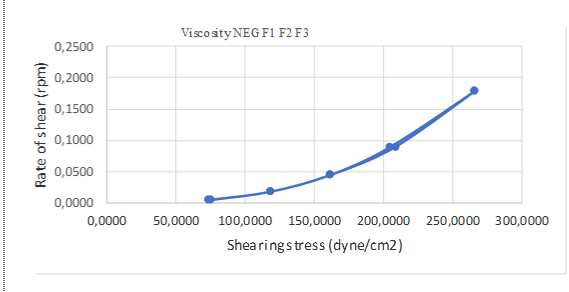 The explanation in the test is that the nanoemulgel Celastrol preparation has flow properties that follow the non-Newton law of pseudoplastic type; it is caused by an increase in the shear rate of a liquid and semi-solid preparation, so the viscosity decreased. The constituent components of Celastrol nanoemulgel may cause this event because they come from the long-chain group of tween 80, and the medium-chain triglyceride of oil. The pseudoplastic type of Celastrol nanoemulgel indicated that the preparation cannot be poured when it is in a storage container. This is shown in the graphic image, which shown that the up and down lines coincide so that each viscosity value is always different since the pseudoplastic type does not have an absolute viscosity value [40].
