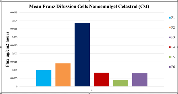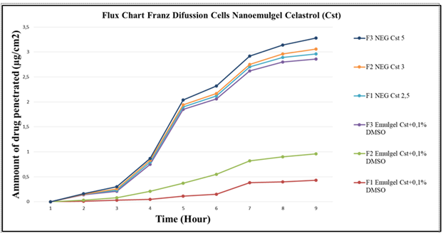 In vitro penetration tests, using Franz diffusion cells (CDF) (fig. 6.7), show that the formula 2.5 μg/ml Celastrol nanoemulgel has difficulty to penetrate the mouse skin membrane, compared to the concentrated formula 3 μg/ml and 5 μg/ml. Those formulas (3 μg/ml and 5 μg/ml) penetrated very well through the mouse skin membrane. This can be caused by the small cumulative amount of Celastrol content in the donor compartment in formula 1 (2.5 μg/ml), affecting the level of penetration or flux. In addition, the three nanoemulgel formulas considered to have better penetration capabilities than the control formula, which is not a nano formula, even the control formula is added by 0.1% DMSO to facilitate penetration. The results obtained that the nanoemulgel formula was still superior to the control formula.