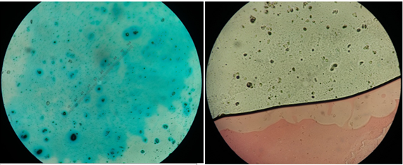 Each nanoemulgel type, initially weighed±250 mg nanoemulgel Celastrol preparation, was placed on the object-glass, then dripped Sudan III for the oil phase and methylene blue for the water phase. The object-glass was again placed on the first plate that contained the preparation, and pressed precisely, for improved accuracy. Then the samples on these plates were observed on an Olympus ® electron microscope (maximum enlargement). Microscope examination results showed that the nanoemulgel preparations developed were nanoemulsion type M/A or O/W.