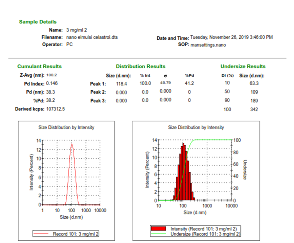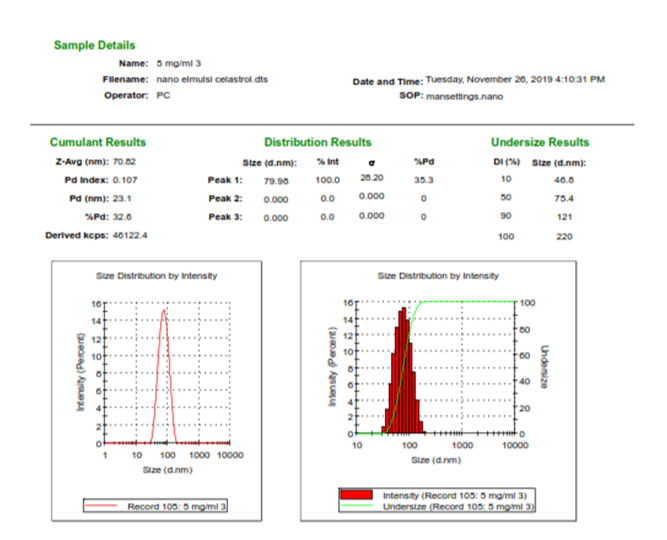 The test is carried out using each Celastrol nanoemulgel that has been formed in a 1 mg weigh carefully and then dissolved with distilled water up to 9 ml. The solution was taken as much as 100 µl and put into a PSA cuvette container and then analyzed using a Marvern® particle size analyzer at 25 °C [21].