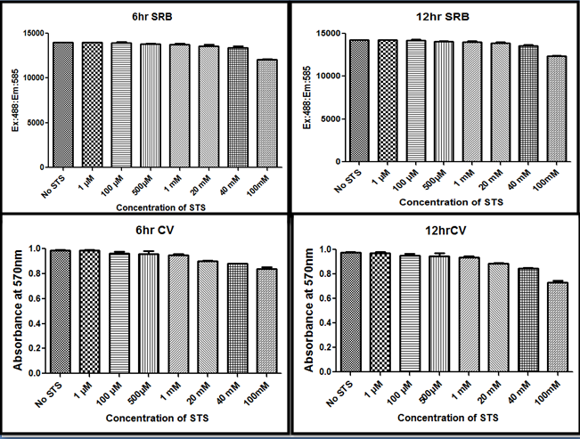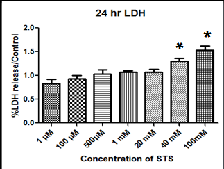 Different concentrations of STS (1 µM, 100 µM, 500µM, 1 mM, 20 mM, 40 mM, and 100 mM) were added to LLC PK1 cells cultured in 48 well plate and the results are shown in fig. 1. STS did not show any toxicity to LLC PK1 cell except for the higher concentration at 40 mM and 100 mM, where both concentrations showed a decrease of 10% and 30% viable cells respectively as compared to control with 24hr incubation time. On the other hand, at a low incubation time (6 hrs and 12 hrs) of cells treated with STS did not show any toxicity (fig. 1).