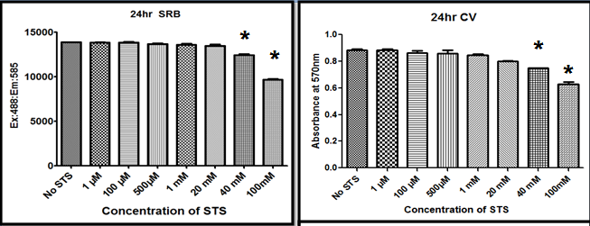 Fig. 1: Sodium thiosulfate (STS) toxicity study. Different concentration of STS was incubated with LLC PK1 cells for different time interval. Different assays like sulforhodamine B (SRB), crystal violet (CV) and lactate dehydrogenase were used to assess cytotoxicity. Results are expressed as mean ± SD of n= 4-6 independent assays (*) P<0.05, statistically different from the control group
